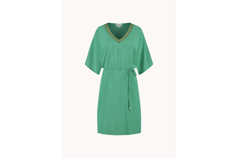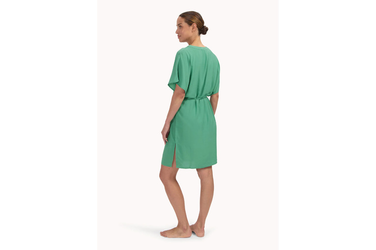 Luchtige tuniek met vlindermouwen en diepe V-hals. Cre?er een taille met het koortje om de middel.